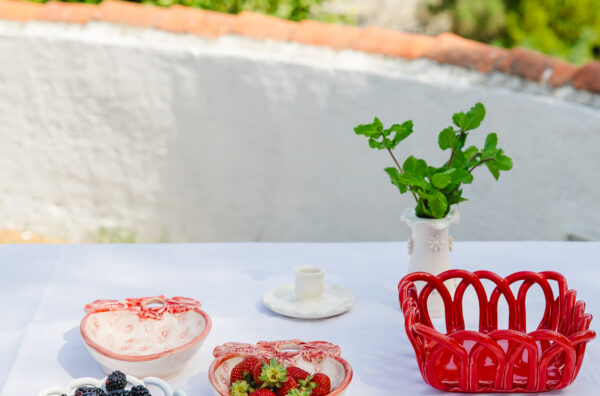 Cada peça é feita à mão, uma a uma, e em pequenas quantidades. Por esse motivo, poderão existir ligeiras variações de tamanho e formato, que a tornam única e exclusiva.