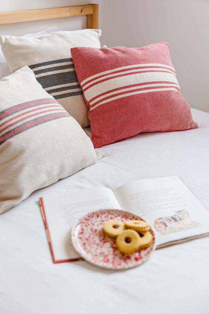 A forma simples e o desenho clássico das riscas evidenciam a textura e a beleza do tecido feito no tear manual. O fecho feito com fitas sarjadas em algodão completa o caracter natural desta capa de almofada.