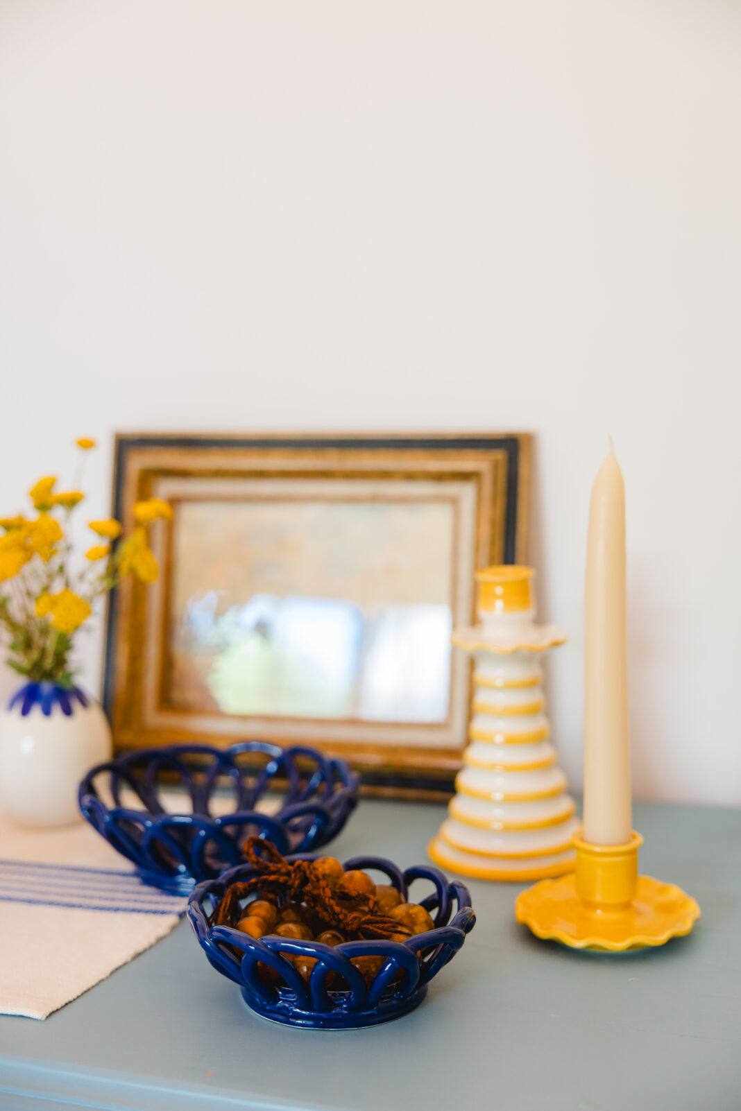 Pintado numa só cor, é ideal para combinar com outros castiçais numa mesa ou numa composição decorativa.