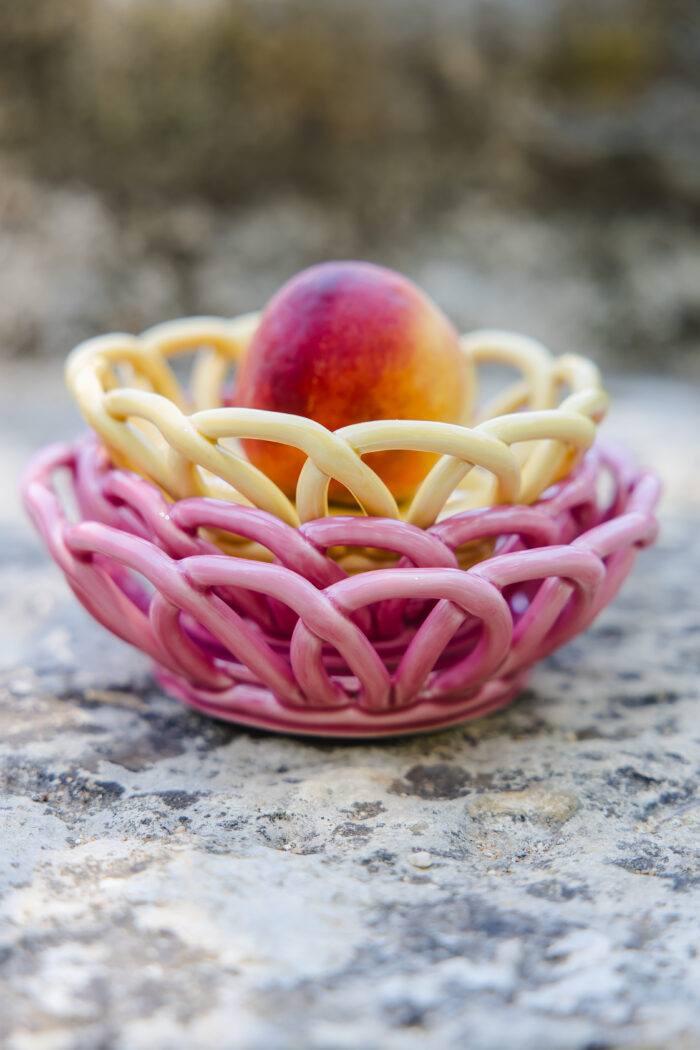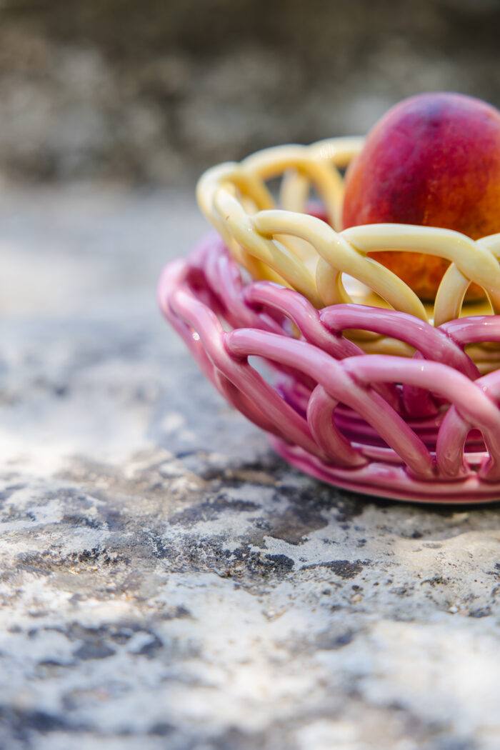 O pequeno cesto de ceramica nasce pelas mãos de uma artesã, que habilmente entrelaça cada peça e lhe dá a forma final. Reinterpreta  de uma forma atual os tradicionais cestos em vime, combinando tradição e modernidade.