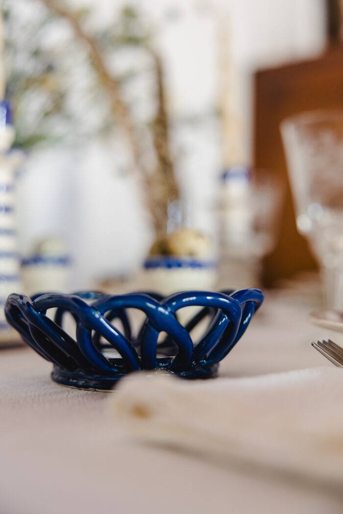 O pequeno cesto de ceramica nasce pelas mãos de uma artesã, que habilmente entrelaça cada peça e lhe dá a forma final. Reinterpreta  de uma forma atual os tradicionais cestos em vime, combinando tradição e modernidade.