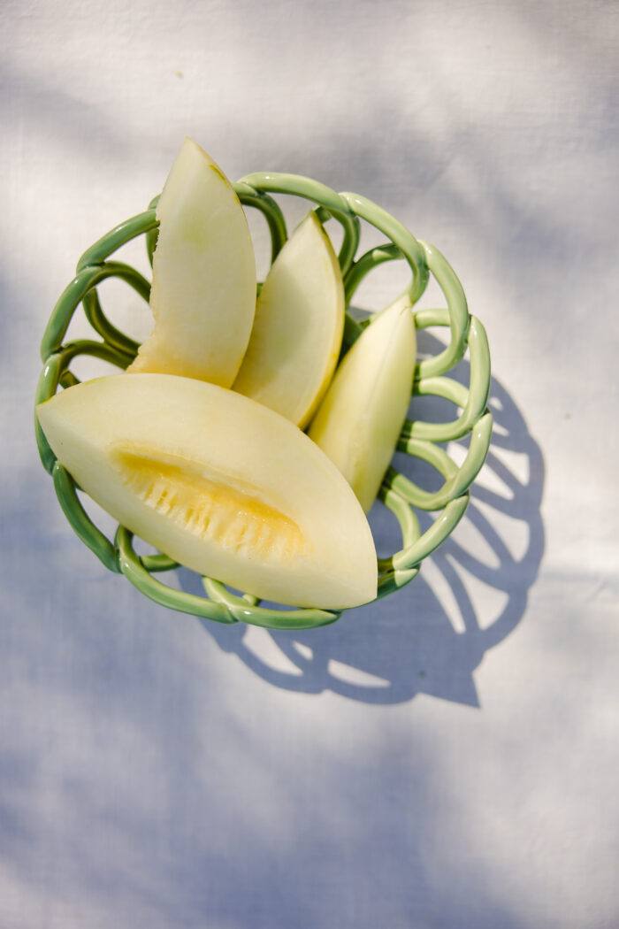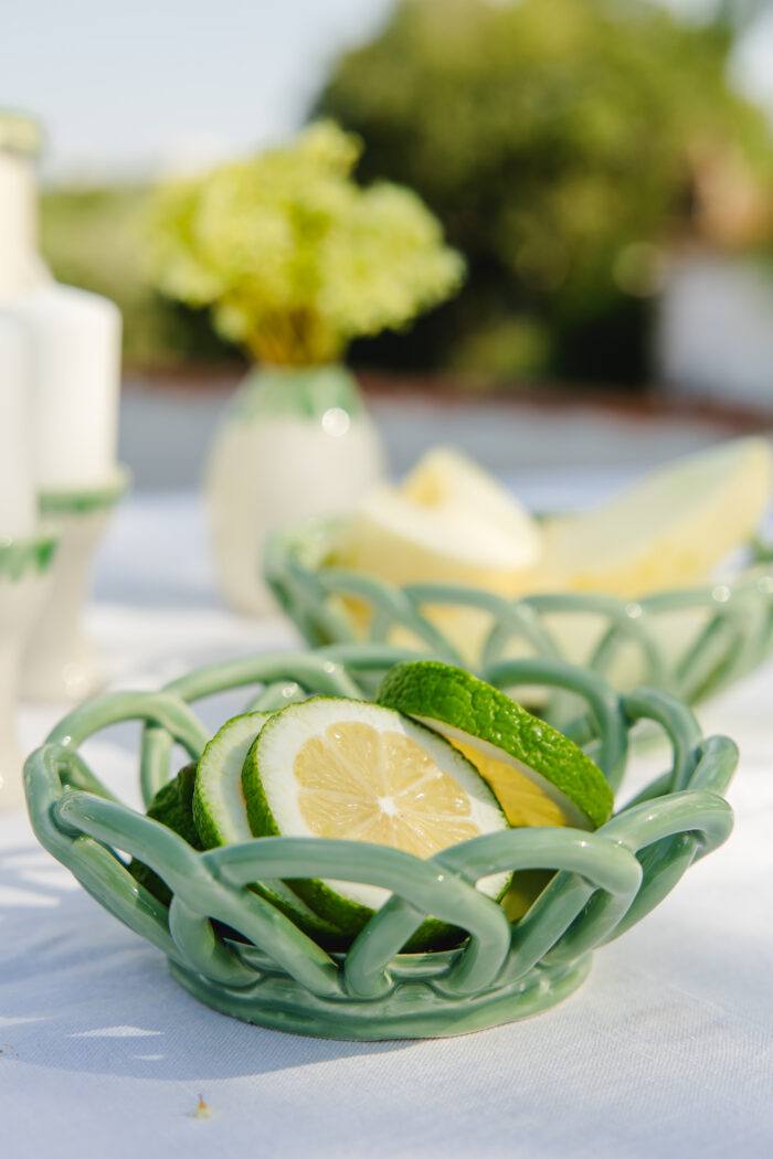O pequeno cesto de ceramica nasce pelas mãos de uma artesã, que habilmente entrelaça cada peça e lhe dá a forma final. Reinterpreta  de uma forma atual os tradicionais cestos em vime, combinando tradição e modernidade.