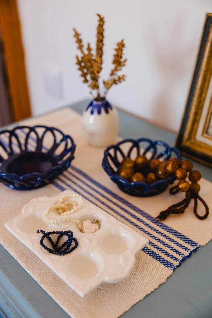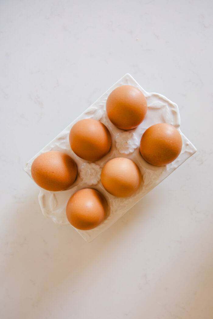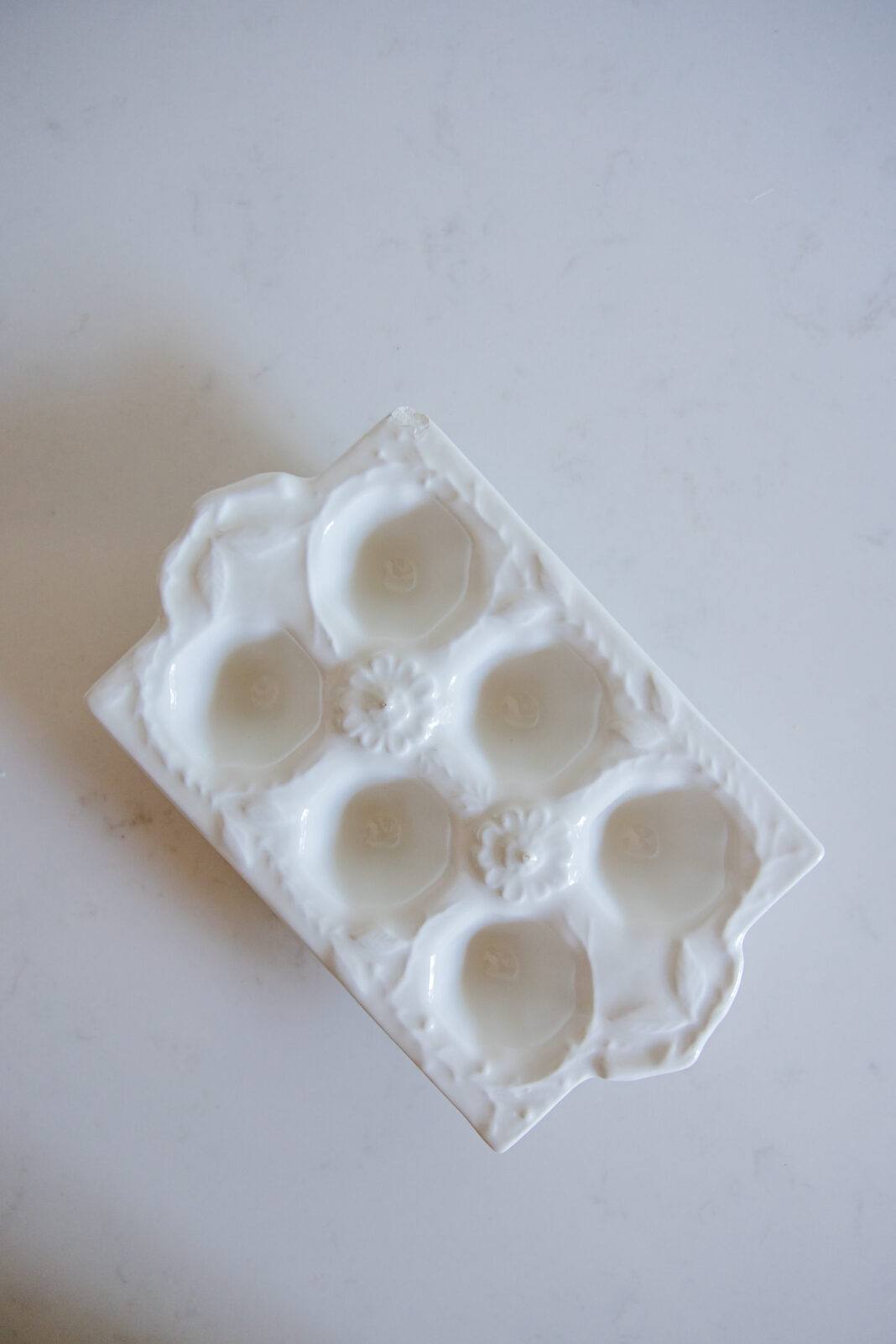 Uma base para ovos singular, com relevo de pequenas flores e um vidrado em branco que a torna ainda mais elegante.